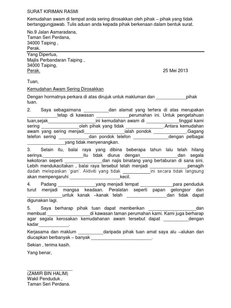 Contoh Surat Rasmi Aduan Kerosakan Lampu Isyarat denizamu Saya mewakili penduduk kampung melayu asli ingin membuat aduan tentang kerosakan jalan tersebut. Karangan Surat Rasmi Aduan Pencemaran Alam Sekitar Resepi Book e. Contoh Surat Rasmi Rayuan Kolej Vokasional - Downlllll via.